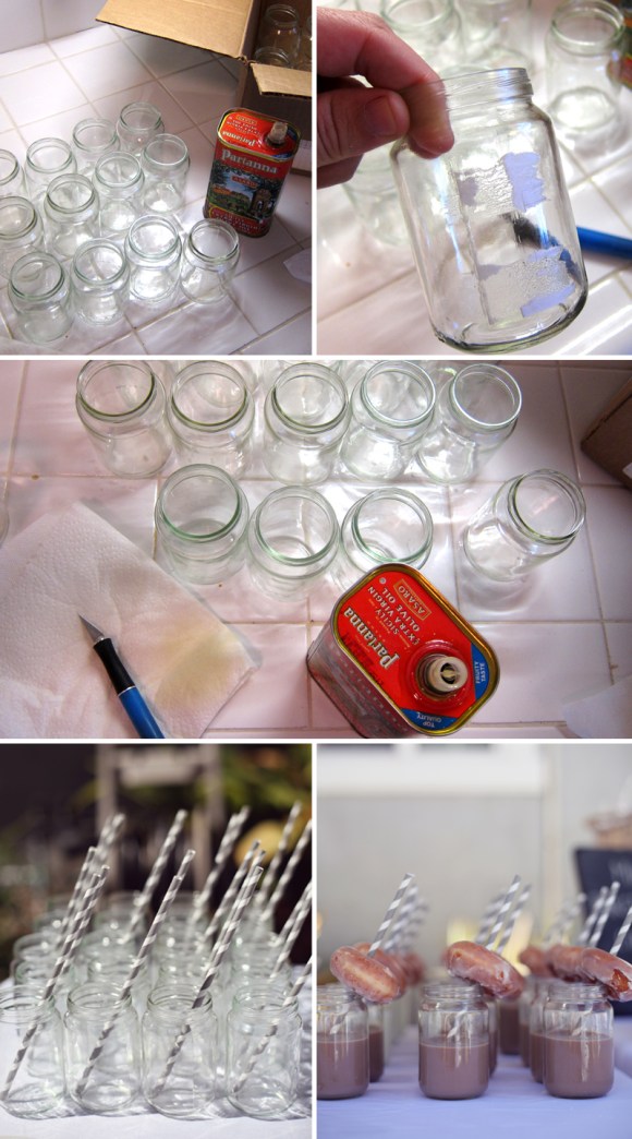 A few months ago I began mentally planning a baby shower for my friend Amy. I have always wanted to set up a milk and donuts display at one of my parties, so I started looking around for little jars. Rather than buying a bunch of mini mason jars, I figured I could up-cycle all the baby food jars that I was currently going through with my 6 month old. :) Much to my husbands dismay, we had tons of dirty, empty jars sitting in our sink waiting to be cleaned for days. Despite soaking them in hot water to peel the labels off, they all still had the hardened and impossible remnants of glue on them. That’s when I discovered the use of olive oil!