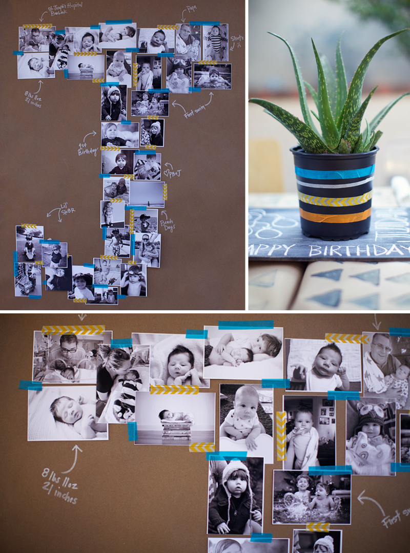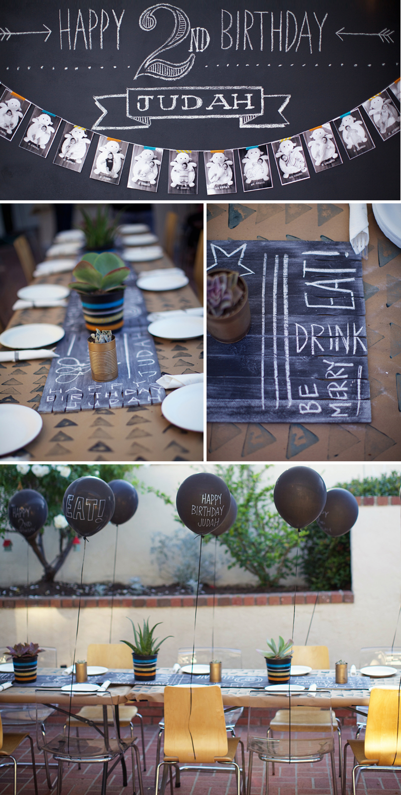 I went with black and white, it’s the two colors that always go well together. I painted a large piece of wood with black chalkboard paint as the table backdrop, and I printed a garland of black and white photos as a timeline of my little guy’s life from birth through 2 years. Instead of tablecloths, I lined the tables with brown builder’s paper, and used a sliced potato to stamp a triangle pattern on it. Check out the DIY here. As table runners, I glued paint sticks together and painted them with the same chalkboard paint. I wrote fun little messages along the table runners, drawings of balloons, stars, birthday cake.
