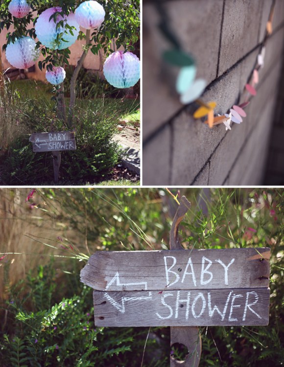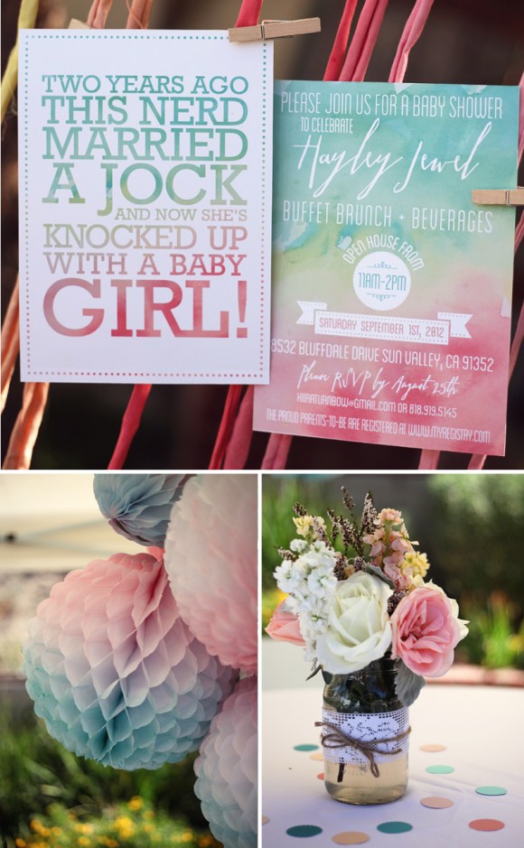 The invitations and all the paper goods I designed and printed myself. Using watercolors, I painted several pages of ombre colors, which I used for all of the backgrounds on the invitations, signs, labels and flags. I used the extra watercolored paper to punch scalloped circles and assemble a watercolor chandelier for baby Hayley’s nursery. For the guest table, I used my grandma’s vintage wooden hutch. I designed “wishes for Hayley” cards for guests to write and clip onto fabric streamers hanging from tree branches. I also created a Meal Train sign up sheet that coordinated with all the paper goods from the party, and guests were able to sign up to bring Amy and Josh meals once Hayley arrived.